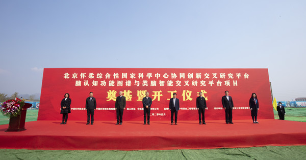 4月10日上午,北京怀柔综合性国家科学中心协同创新交叉研究平台——脑认知功能图谱与类脑智能交叉研究平台项目举行奠基暨开工仪式。怀柔区委书记、科学城党工委书记戴彬彬,怀柔科学城党工委委员、管委会副主任伍建民,中国科学院自动化研究所所长徐波,中国科学院生物物理研究所所长许瑞明,项目监理方、设计方领导,集团公司党委书记、董事长陈先瑞,副总经理、总工程师陈劲共同出席。